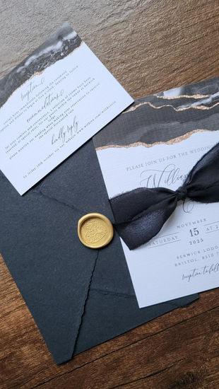 Printed on beautifully textured card, adorned with a black silk raw-edge ribbon and finished with delicate black and gold detailing that adds a touch of refined luxury. While the clean layout and graceful typography add an air of understated romance.